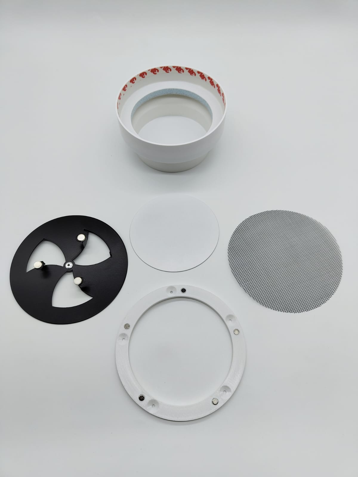 Диффузор состоит из пластикового перехода, металлической заслонкой, которой можно регулировать поток воздуха, либо полностью перекрыть его. К заслонке с помощью магнитов крепится декоративная круглая панелька, которую можно покрасить в цвет потолка. Так же по ободку диффузора имеется надёжный двухсторонний скот марки 3М, к которому крепится полотно натяжного потолка. Наши диффузоры оснащены москитной сеточкой, которая препятствует попаданию насекомых в помещение.